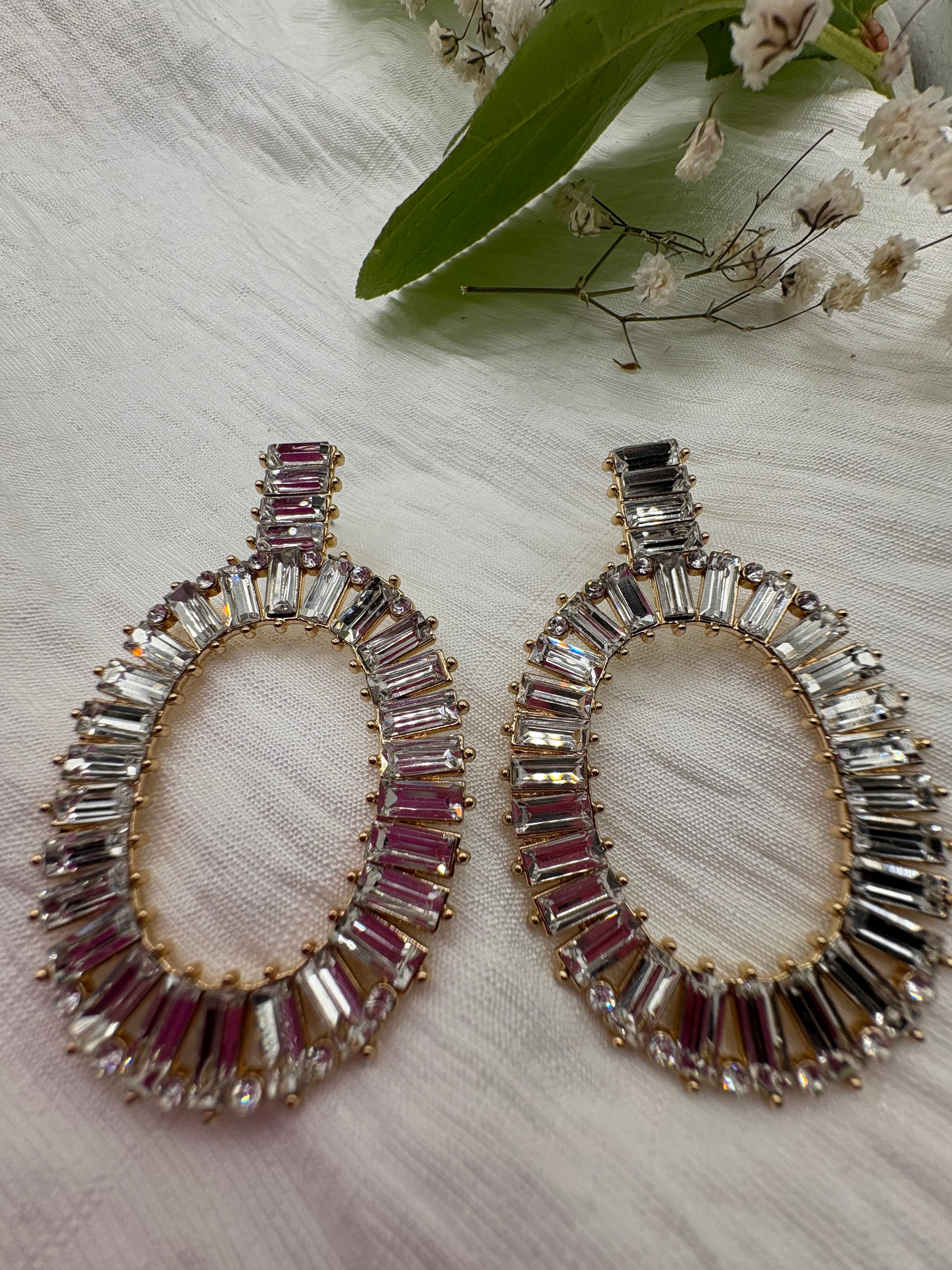 Oval drop earrings shimmer with a halo of baguette-cut crystals in a sleek mix of smoky grey and clear stones, all set in radiant gold